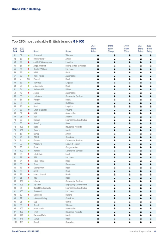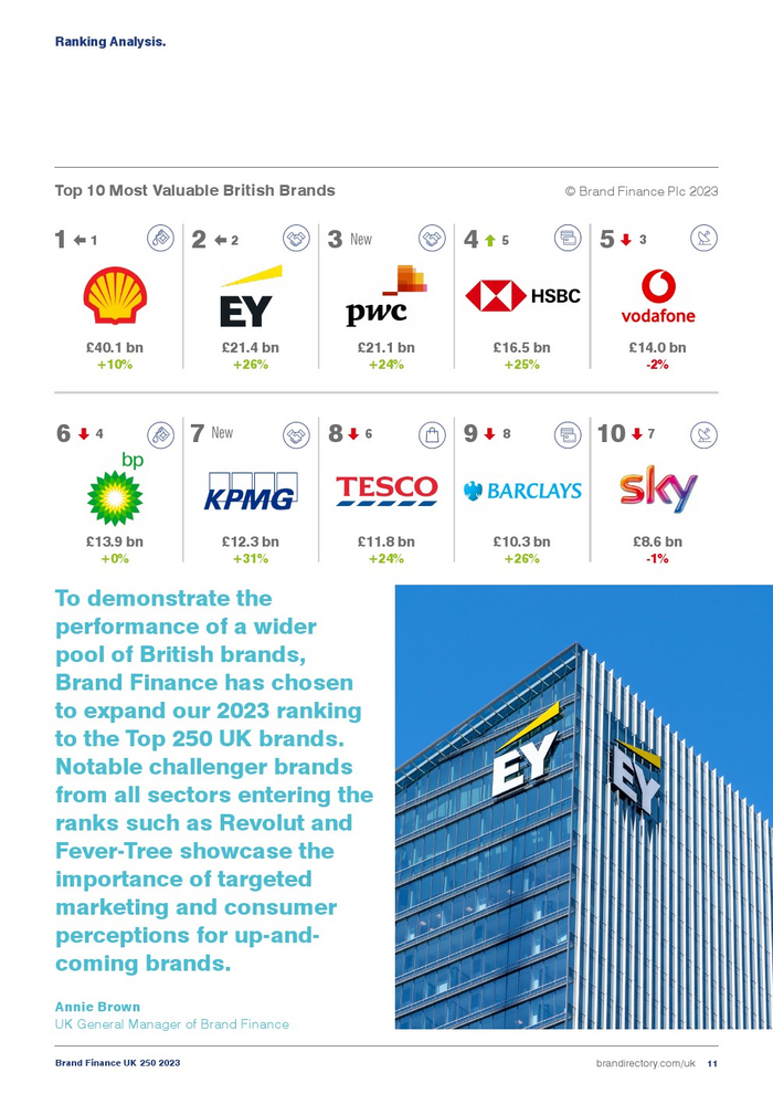 Brand Finance的排名反映了首字母缩略词品牌的重要性稳步上升。在英国最有价值的100个品牌中有20个是首字母缩写。10强中有安永(EY)、普华永道(PwC)、汇丰(HSBC)、英国石油(BP)和毕马威(KPMG)。