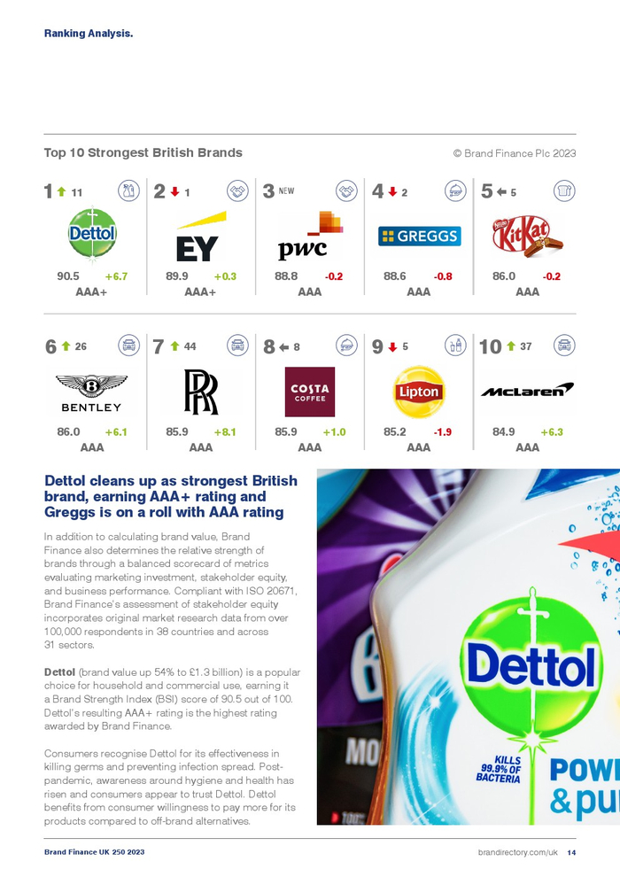 Dettol成为最强大的英国品牌,获得AAA+评级,Greggs获得AAA评级