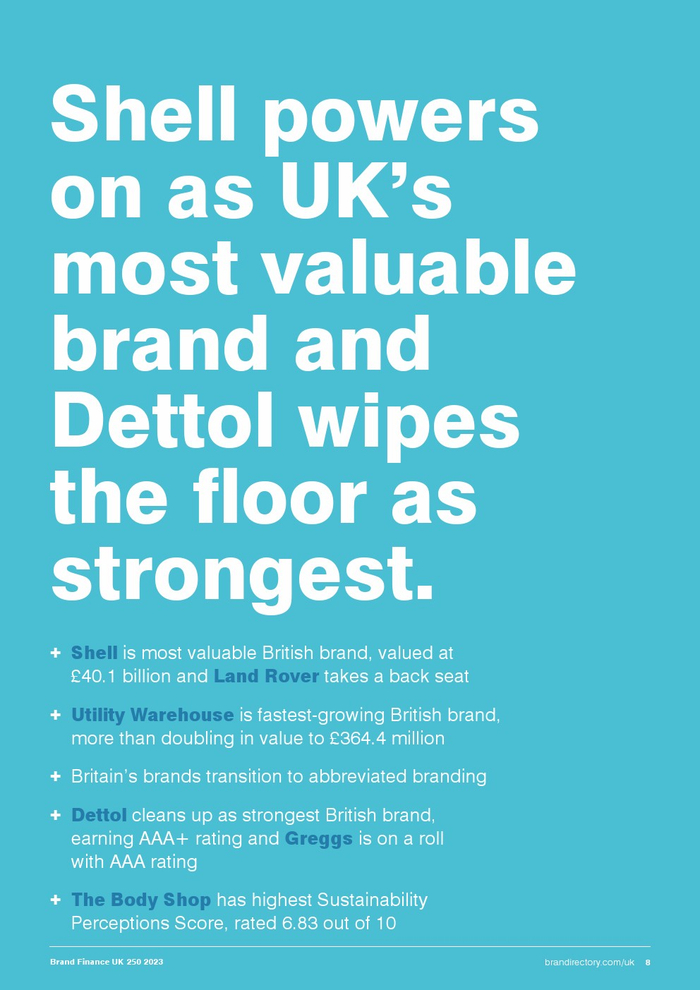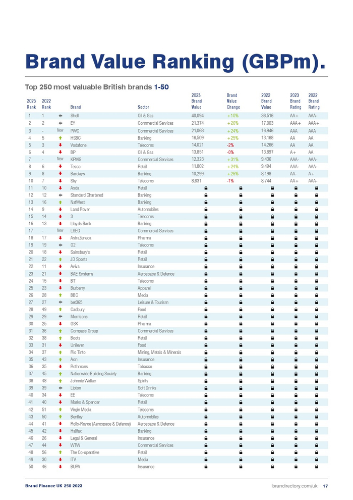 壳牌(品牌价值上升10%,达到401亿英镑)保住了英国最有价值品牌的地位。