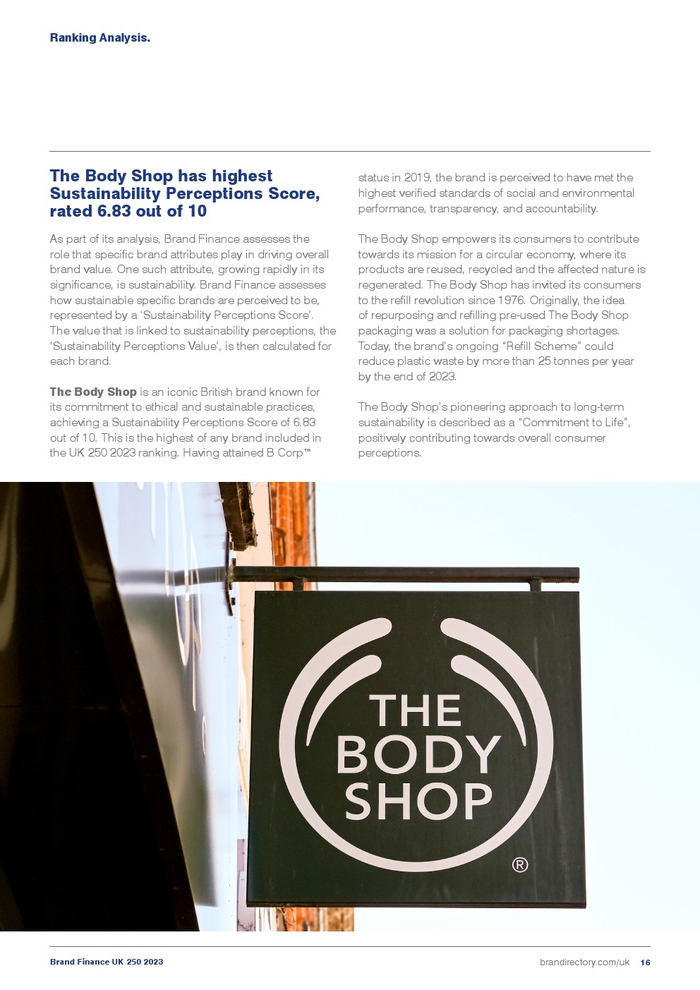 美体小铺是一个标志性的英国品牌,以其对道德和可持续实践的承诺而闻名,可持续发展认知获得了6.83分(满分10分)。这是2023年英国250强排名中该项得分最高的。该品牌在2019年获得了B Corp地位,被认为在社会和环境绩效、透明度和问责制方面达到了最高的认证标准。