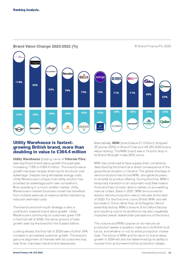 Utility Warehouse是增长最快的英国品牌,价值翻了一番多,达到3.644亿英镑