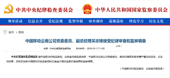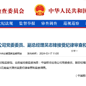 C114讯 3月18日消息 据中国移动纪检监察组、云南省纪委监委消息,中国移动云南公司党委委员、副总经理吴志锋涉嫌严重违纪违法,已主动投案,目前正接受中国移动纪检监察组和云南省大理州监委纪律审查和监察调查。