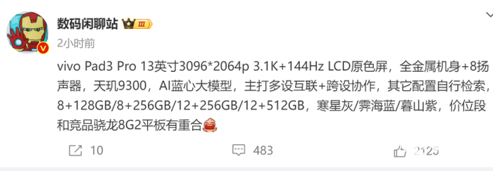 vivo Pad3在此前已经有了一些爆料,根据博主@数码闲聊站此前消息,vivo Pad3 Pro将搭载13英寸3.1K LCD原色屏,分辨率为3096*2064,支持最高144Hz屏幕刷新率;将搭载天玑9300芯片,拥有8+128GB/8+256GB/12+256GB/12+512GB配置版本;机身采用全金属材质+8扬声器;主打多设互联+跨设协作,支持多终端深度互联、通信共享功能等,支持平板使用手机网络和接打电话或者收发短信。vivo Pad3 Pro将拥有寒星灰、霁海蓝、暮山紫等配色。