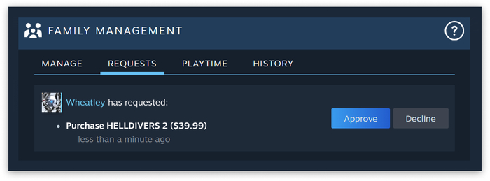 为优化这一流程,Steam 家庭推出了新的购买方式:儿童帐户可请求家庭中的一名成人为其购物车付款。该成人可通过移动设备或电子邮件批准购买并为其付款。批准后,购物车内的所有游戏都将添加到儿童的帐户中。