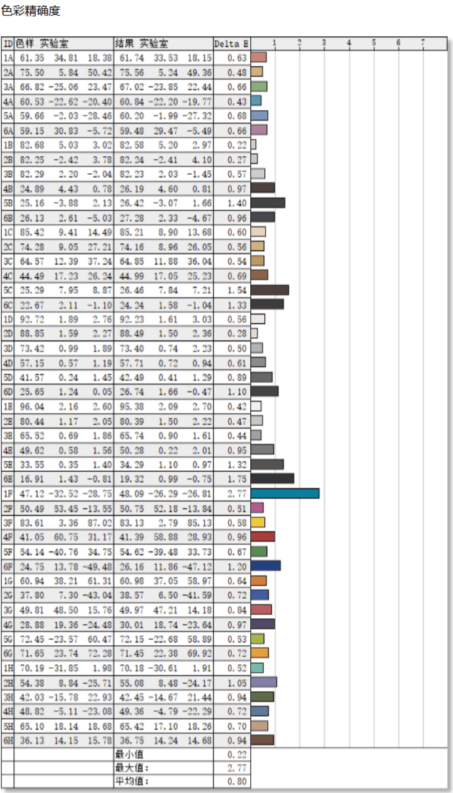 色彩精准度的测试中,科睿P5显示器结果为平均△E值为0.80,色彩还原十分精准,一般来说△E值小于3肉眼几乎看不出色彩方面的差异,科睿P5甚至最大值都大于3,科睿P5的表现可以说相当优秀了。