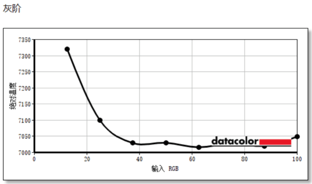 灰阶方面,显示器在40%-100%的亮度下表现比较稳定,整体色温维持在7050K上下,色温相较于标准色温略微偏冷。