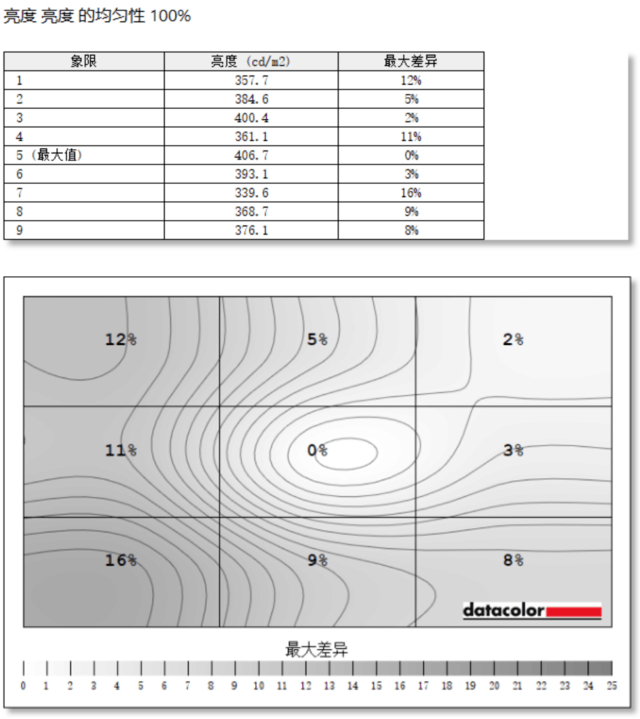 亮度均匀性的测试中,科睿P5显示器整体表现也很优秀,亮度最大为第5象限,最大差异在第7象限,差值为67.1cd/m?。