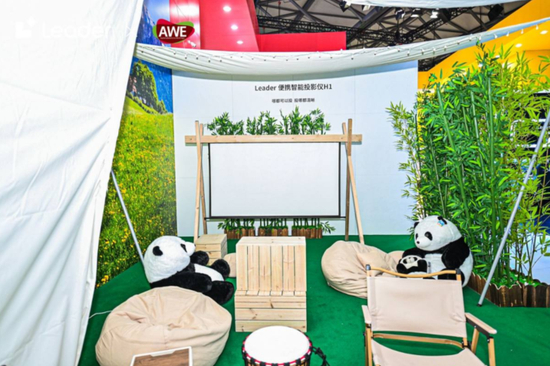 以Leader这么跳脱的个性,只做电视实在是不够COOL。就在旁边有一大块天幕,还有露营桌和克米特椅,躺下就能看到Leader便携智能投影仪H1放的电影。这是一款精准地“踩准”了年轻消费群体的露营需求,体积小随身携带更方便,而且待机时间长,一次充电能超长时间观影,最让老马喜欢的是,他可以90度随意旋转,让“躺平”在天花板上看电影由梦想变为了现实。
