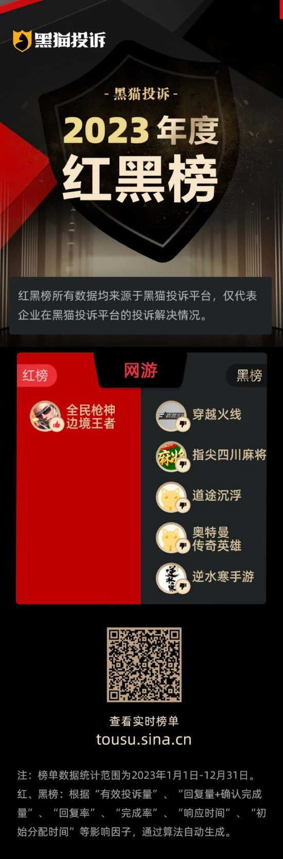 黑猫投诉发布2023年度网游领域红黑榜榜单:游戏财产安全无保障 穿越火线点券无故减少