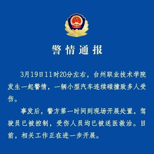 据浙江台州市公安局椒江分局通报,3月19日11时20分左右,台州职业技术学院发生一起警情,一辆小型汽车连续碰撞致多人受伤。受伤人员均已被送医救治,肇事车辆的驾驶员目前也已被控制。