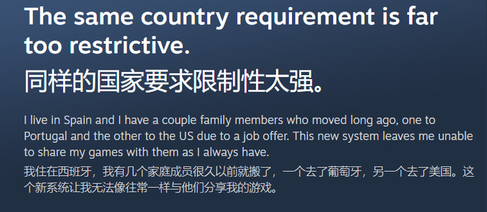 比起这些问题,还有一个隐藏麻烦,那就是锁区问题:海外玩家反映称大家都只能在同一地区才能组建Steam家庭,这可能并不适用于人口流动频繁的当下和未来。