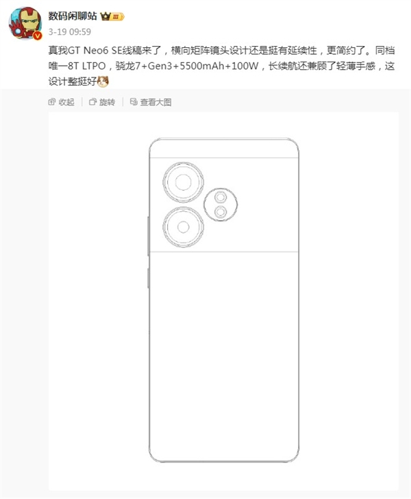 此外,据近期博主@数码闲聊站的爆料,真我GTNeo6SE有望采用横向矩阵镜头设计,配备"同档唯一8TLTPO"屏幕,并搭载5500mAh大电池以及支持100W有线快充的功能。