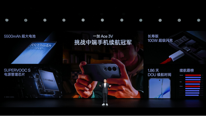 续航方面,李杰认为,普及「超长续航」是正确的方向。在AI加持下,一加 Ace 3V的顶级续航能力得到了再进化。一加Ace 3V拥有超高能效的第三代骁龙 7+,5500mAh超大电池,SUPERVOOC S电源芯片和AI调度,使得续航Dou成绩达到1.86天。