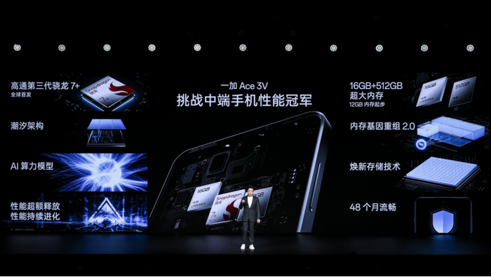 性能方面,作为大内存普及者,一加Ace 3V坚持12GB内存起步,并且带来至高16GB LPDDR5X和512GB UFS4.0闪存组合,并带来旗舰同款、独家自研的内存基因重组2.0技术、焕新存储技术,让手机使用更加流畅。同时,一加Ace 3V全球首发高通第三代骁龙 7+移动平台,成为中端手机的性能天花板。
