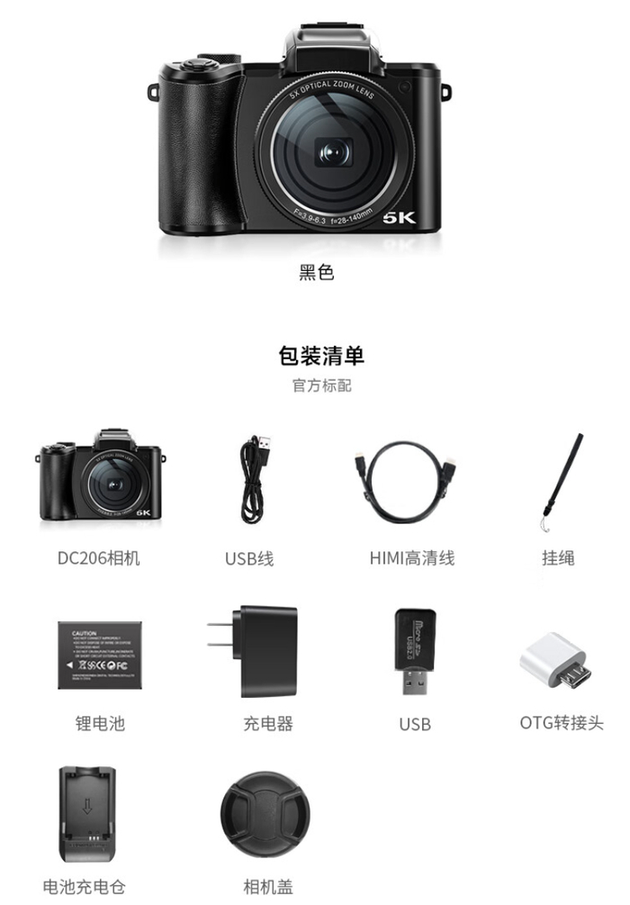 该相机支持六轴防抖、自动对焦,内置 10 多种特效,自带闪光灯,配有 HDMI 接口 5K 视频输出(5120*2880 30 帧)。
