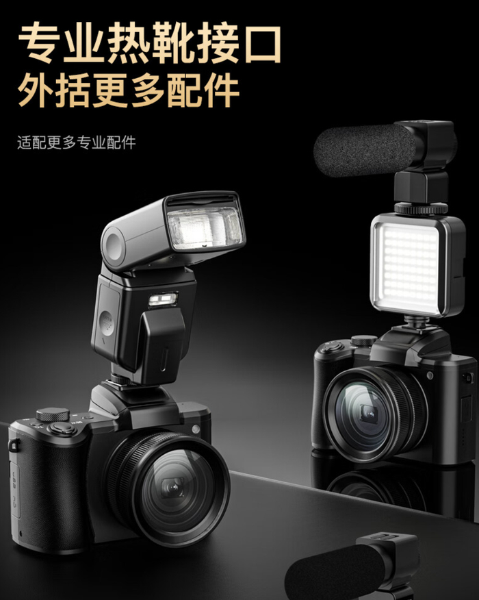 该相机还配有热靴口,搭载 1220mAh 锂电池,可插 TF 卡,支持 5 倍光学变焦、10 倍数码变焦。