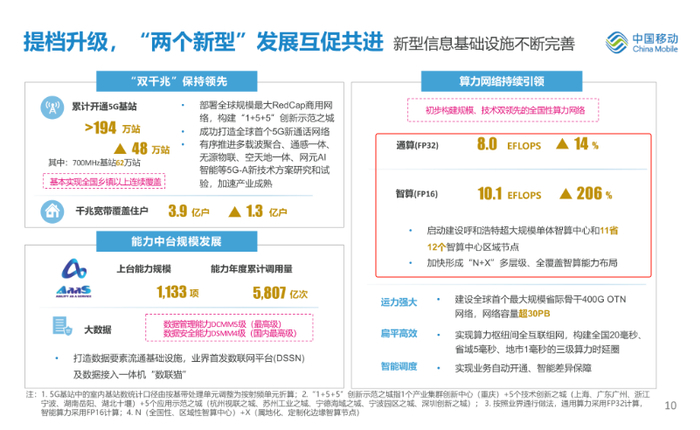财报显示,截至 2023 年12月底,中国移动已开通基站总数超 660 万个,网络规模全球最大。数据中心能力覆盖国家“东数西算”全部枢纽节点,通用算力规模达8 EFLOPS(同比增长14%),智能算力规模达 10.1 EFLOPS(同比增长206%),旗下全国规模最大算力并网平台现已纳管10余家厂商包括通算、智算、超算和量子算力在内的超3.3 EFLOPS社会算力。随着算网大脑全网试商用,算网业务涵盖东数西算、智算超算、数据快递等 115 种,在大规模数据灾备存储、影视渲染、天文等领域实现算网应用加速突破,中国移动算力网络已正式迈入“融合统一”的 2.0 新阶段。