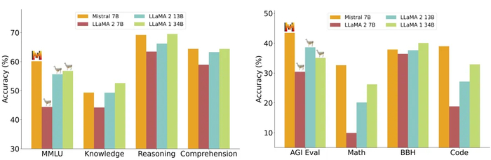 Mistral AI 的第一个 7B 模型发布于 2023 年 9 月,在多个基准测试中实现了优于 Llama 2 13B 的好成绩,让 Mistral AI 一下子就打出了知名度。