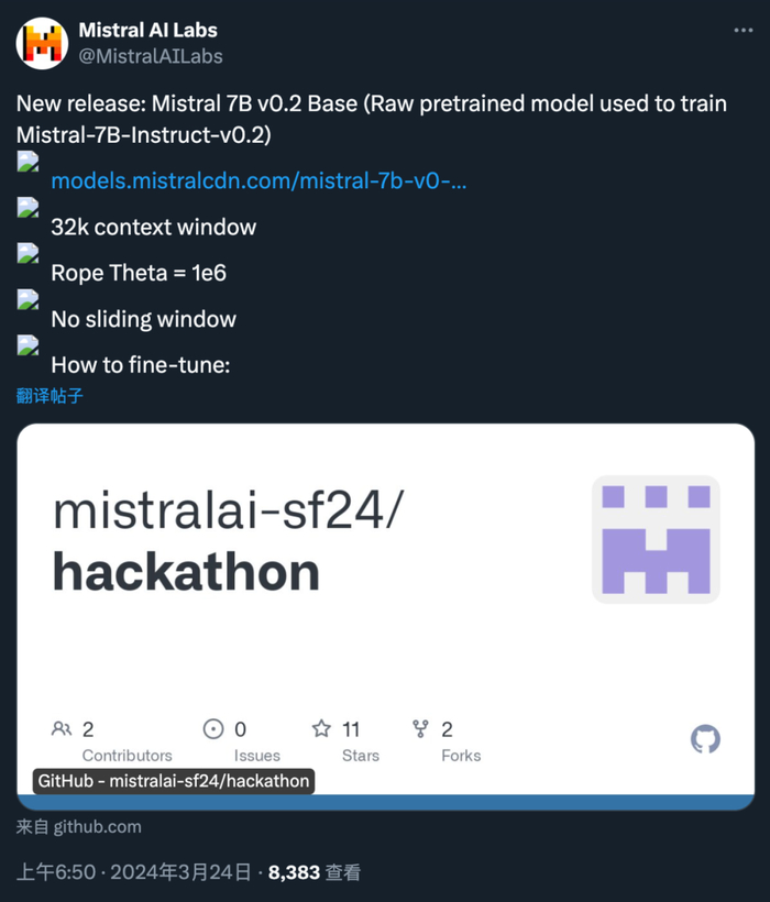 32K上下文,Mistral 7B v0.2 基模型突然开源了