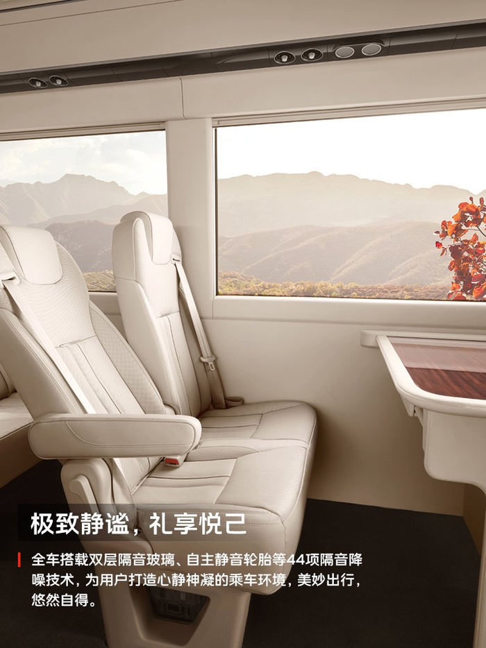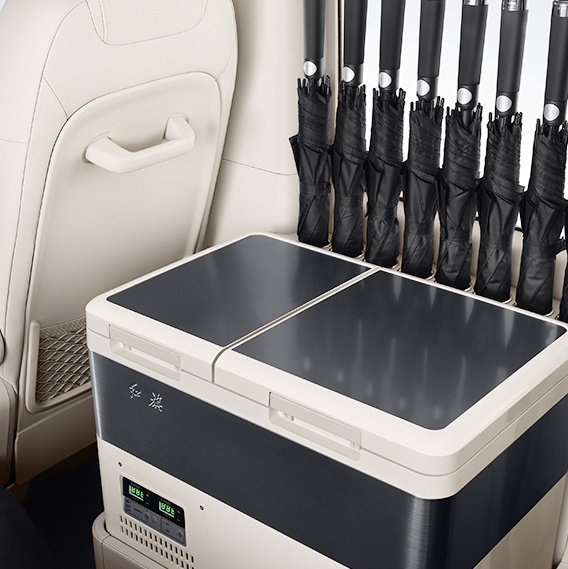 其他方面,这款车还拥有 35L 大容量车载冰箱、侧旁雨伞槽设计、一体式座椅、全新设计折叠秘书桌、220V 电源接口、高性能制动系统。