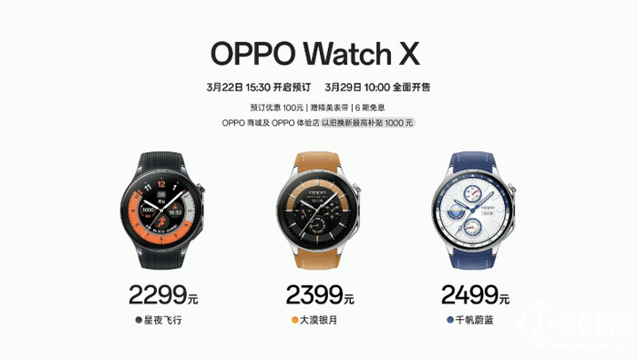 以全智能引领大众运动,OPPO Watch X 整合一众顶尖旗舰配置,蓝宝石水晶表镜、精钢一体表身、顶级健康传感器、双频GPS、专业领跑功能,每一项都是全新体验。售价方面,OPPO Watch X 星夜飞行2299元,大漠银月2399元、千帆蔚蓝2499元。目前,全系产品已开启首发预订活动,参与用户享受立减 100 元优惠,并将于3月29日10点在各大电商平台以及线下OPPO门店同步开售,敬请关注!