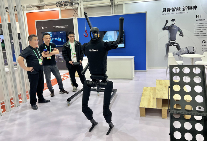 在此前英伟达GTC大会上,作为英伟达合作方的宇树科技刚刚露过面,受到了较多的关注。这是一家较早做四足机器人的公司,也入局了人形机器人。此次展台,宇树科技重点展示了首款通用人形机器人产品Unitree H1,能走能跑还能跳舞。