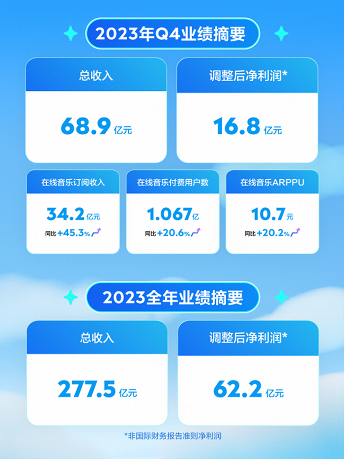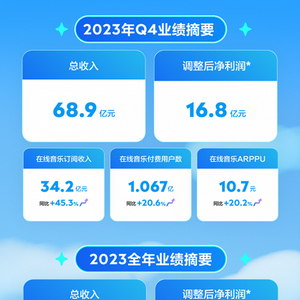 在此过程中,TME多次对外强调,业绩下滑是因为受宏观环境、其他平台竞争加剧等多方因素影响。2023年,这些影响继续发挥作用。第四季度同比下降51.6%,全年收入同比下降34.2%至人民币104.3亿元,首次跌至在线音乐之下。