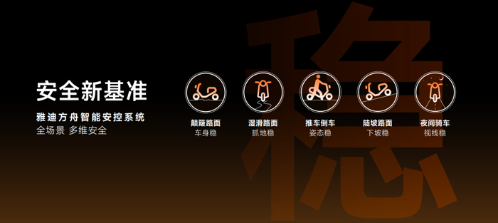 在系统分析和研究用户用车场景的基础上,雅迪通过软件和硬件的协同,实现对颠簸路面、湿滑路面、推车倒车、陡坡下行路段、夜间骑车等多场景用车环境下的主动安全控制,为用户带去行稳致远的骑行体验,重新定义电动两轮车行业的安全新基准。