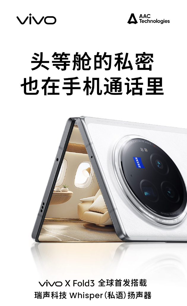 其中 X Fold3 上方定制的 Whisper 扬声器是 AAC 首个肩并肩双振膜防漏音扬声器,重量轻至0.95g,厚度仅2.15mm,满足折叠机极致轻薄的要求。同时双驱动肩并肩设计通过反相驱动实现隐私通话,把头等舱的私密感搬进了手机通话里,满足高端商务用户对安全隐私的苛刻要求。X Fold3 另一项定制 AeroEngine 重量仅为 1g,领启 X 轴马达“1克时代”。