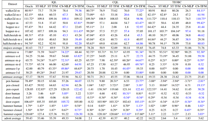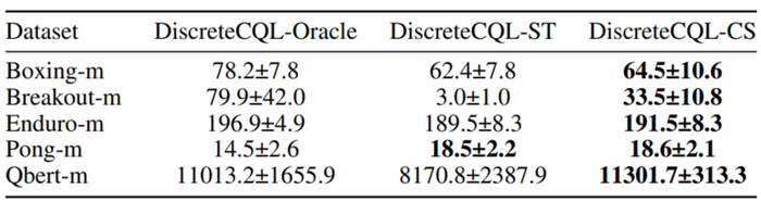 • 基于 IQL 基线效果最稳定,并且比较 IQL-CS 能够表现出和 IQL-Oracle 相当的优异性能,而 CQL 基线偶尔会出现策略崩溃的结果;