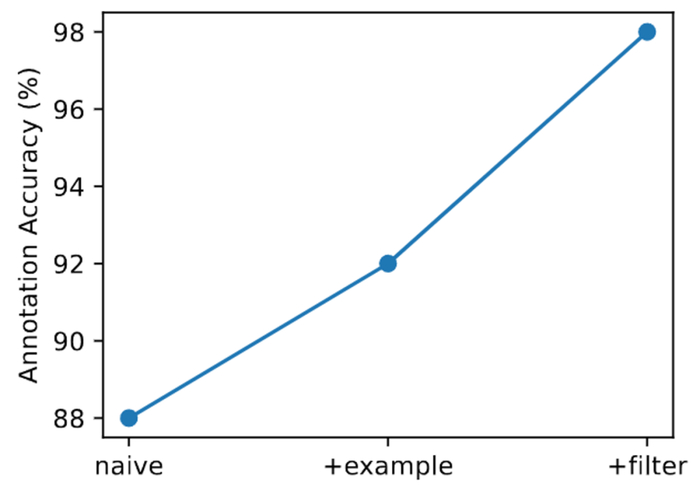 以上实验结果表明,每个组件都显著提高了标注的可靠性,最终实现了与专家注释 98% 的一致率。