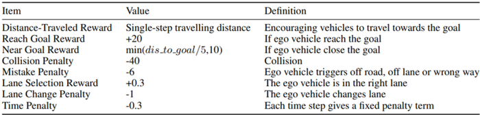 RLHF 方法是否能在真实的复杂任务上成功替代手工设计的奖励函数?研究人员使用了 NeurIPS 2022 中 SMARTS 自动驾驶竞赛的环境,该环境提供了相对真实和多样化的自动驾驶场景,并使用成功率,速度和舒适度等多个指标评估模型的性能。其中,冠军方案针对该任务设计奖励函数会经过多次试错,并在多次训练过程中不断调整完善各项奖励时间及系数,最终形成了以下极为复杂的奖励函数构成,设计成本极高: