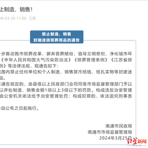 3月26日,江苏南通市民政局和南通市市场监督管理局通过“南通发布”发布了一条“禁止制造、销售封建迷信殡葬用品的通告”,其中规定全市范围内禁止任何单位和个人制造、销售冥币纸钱、纸扎实物等封建迷信殡葬用品,随后引发关注。