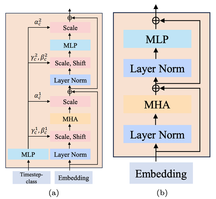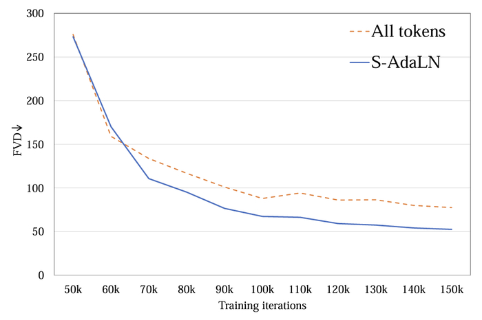 2. 条件注入模式:探究了(a)S-AdaLN 和(b)all tokens 两种方式 (图 5)。S-AdaLN 通过 MLP 将条件信息转换为归一化中的变量注入到模型中。All token 形式将所有条件转化为统一的 token 作为模型的输入。实验证明,S-AdaLN 的方式相较于 all token 对于获得高质量的结果更加有效 (图 6)。原因是,S-AdaLN 可以使信息被直接注入到每一个模块。而 all token 需要将条件信息从输入逐层传递到最后,存在着信息流动过程中的损失。