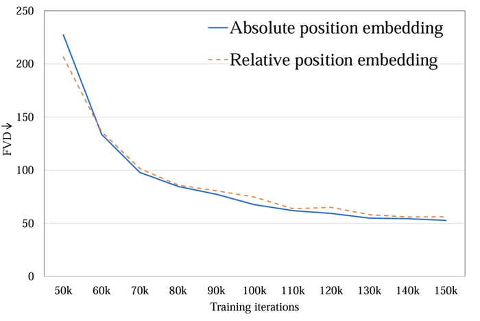 3. 时空位置编码:探究了绝对位置编码与相对位置编码。不同的位置编码对最后视频质量影响很小 (图 7)。由于生成时长较短,位置编码的不同不足以影响视频质量,对于长视频生成,这一因素需要被重新考虑。