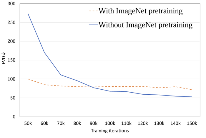 4. 模型初始化:探究使用 ImageNet 预训练参数初始化对模型性能的影响。实验表明,使用 ImageNet 初始化的模型具有较快的收敛速度,然而,随着训练的进行,随机初始化的模型却取得了较好的结果 (图 8)。可能的原因在于 ImageNet 与训练集 FaceForensics 存在着比较大的分布差异,因此未能对模型的最终结果起到促进作用。而对于文生视频任务而言,该结论需要被重新考虑。在通用数据集的分布上,图像与视频的内容空间分布相似,使用预训练 T2I 模型对于 T2V 可以起到极大的促进作用。