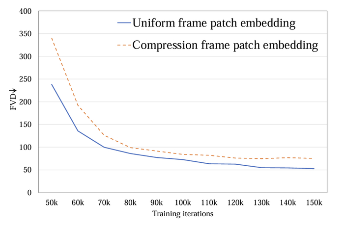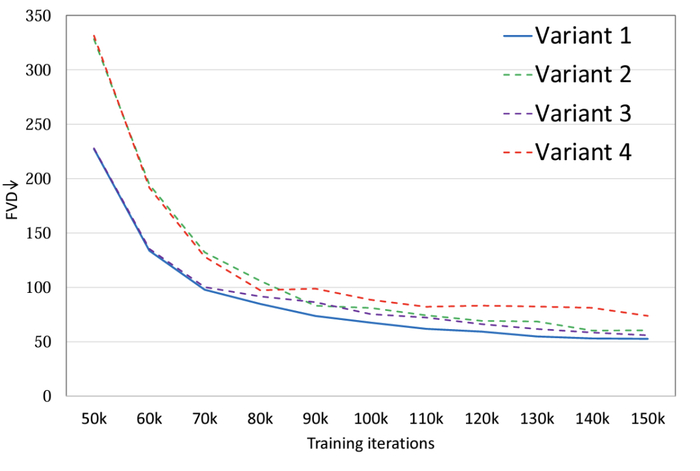 实验表明 (图 2),通过对 4 种模型变体设置相同的参数量,变体 4 相较于其他三种变体在 FLOPS 上有着明显的差异,因此 FVD 上也相对最高,其他 3 种变体总体性能类似,变体 1 取得了最优异的性能,作者计划未来在大规模的数据上做更加细致的讨论。