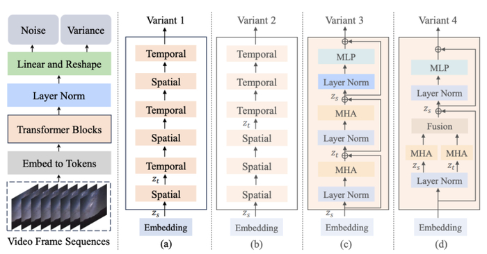 作者提出了 4 种不同的 Latte 变体 (图 1),从时空注意力机制的角度设计了两种 Transformer 模块,同时在每种模块中分别研究了两种变体(Variant):