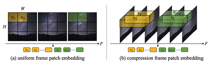 1.Token 提取:探究了单帧 token(a)和时空 token(b)两种方式,前者只在空间层面压缩 token,后者同时压缩时空信息。实验显示单帧 token 要优于时空 token(图 4)。与 Sora 进行比较,作者猜测 Sora 提出的时空 token 是通过视频 VAE 进行了时间维度的预压缩,而在隐空间上与 Latte 的设计类似都只进行了单帧 token 的处理。