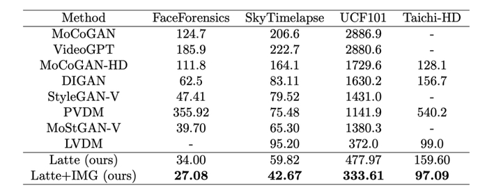 作者分别在 4 个学术数据集(FaceForensics,TaichiHD,SkyTimelapse 以及 UCF101)进行了训练。定性与定量(表 2 和表 3)结果显示 Latte 均取得了最好的性能,由此可以证明模型整体设计是具有优异性的。