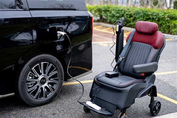 第二排副驾侧座椅为福祉座椅,承重150kg,可能够旋转出车外并降低高度,方便残疾人上下车,更令人拍案的是,该座椅还可与机构分离,变成轮椅使用,并且能够使用车辆外放电功能充电,满电能跑20公里。