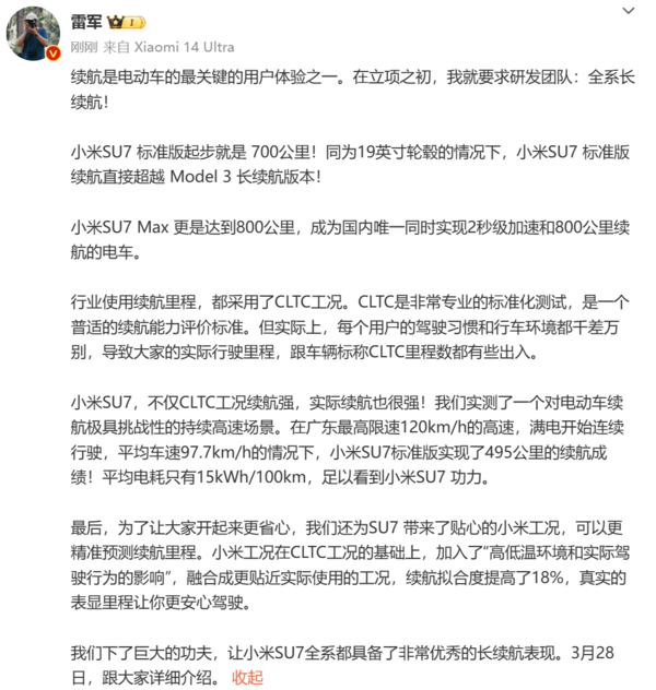 【CNMO科技消息】距离小米SU7的正式上市已经不到一天时间,作为小米集团创始人的雷军依旧在微博卖力的为行车进行宣传。3月27日晚,雷军在微博发文,谈到了小米SU7的续航和电耗。