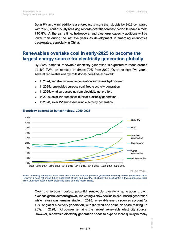 2028年:可再生能源发电量占全球发电量42%以上,其中风能和太阳能光伏发电量占比翻番,达到25%。