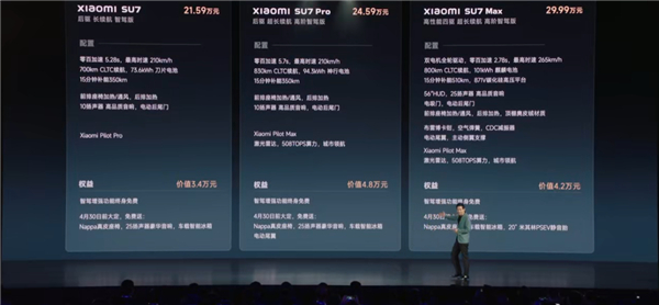快科技3月28日消息,今晚,小米汽车首款车型小米SU7正式上市发布,新车提供SU7、SU7 Pro、SU7 Max三款车型,售价分别为21.59万元、24.59万元、29.99万元。