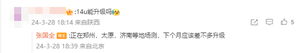 有网友询问张国全小米14 Ultra能否升级,张国全回复称:“正在郑州,太原,济南等地场测,下个月应该差不多升级”。