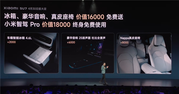 这个价格回归了小米手机初创时1999元的价格起点。据称,在4月30日前下单的大定客户可以免费获得总价值16000元的三项赠送物品。其中包括一个价值2000元的车载智能冰箱,一个价值6000元的豪华音响系统以及一个价值8000元的Nappa真皮座椅。
