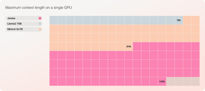 在成本方面,Jamba 可以在单个 GPU 上容纳 140K 上下文。与当前类似大小的其他开源模型相比,Jamba 能提供更多的部署和实验机会。