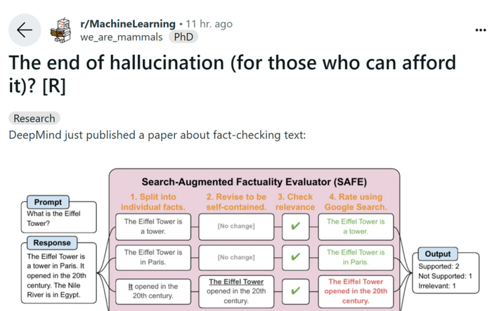 今日,社媒平台 reddit 上的一则帖子引起网友热议。帖子讨论的是谷歌 DeepMind 昨日提交的一篇论文《Long-form factuality in large language models》(大语言模型的长篇事实性),文中提出的方法和结果让人得出大胆的结论:对于负担得起的人来说,大语言模型幻觉不再是问题了。