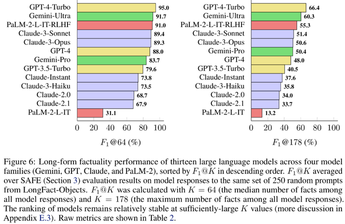 结果发现,一般而言,较大的语言模型可以实现更好的长篇事实性。如下图 6 和下表 2 所示,GPT-4-Turbo 优于 GPT-4,GPT-4 优于 GPT-3.5-Turbo,Gemini-Ultra 优于 Gemini-Pro,PaLM-2-L-IT-RLHF 优于 PaLM- 2-L-IT。