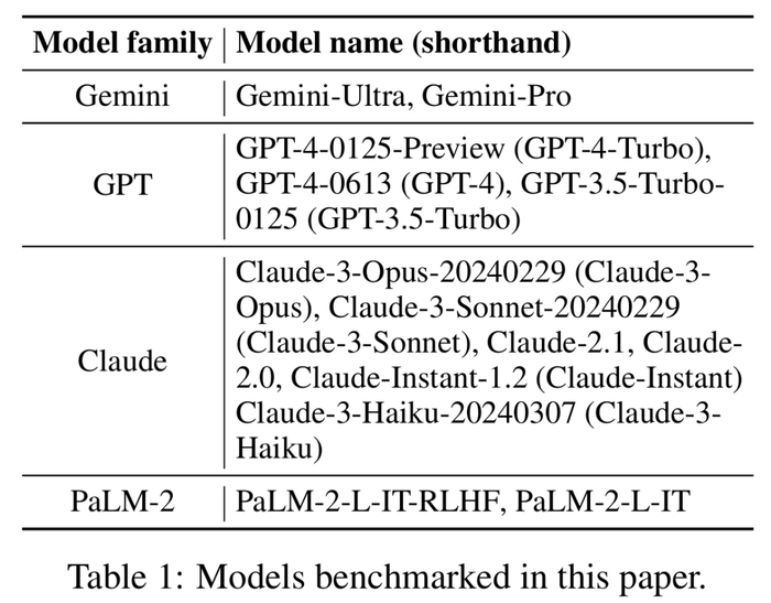 最后,研究者在 LongFact 上对下表 1 中四个模型系列(Gemini、GPT、Claude 和 PaLM-2)的 13 个大语言模型进行了广泛的基准测试。